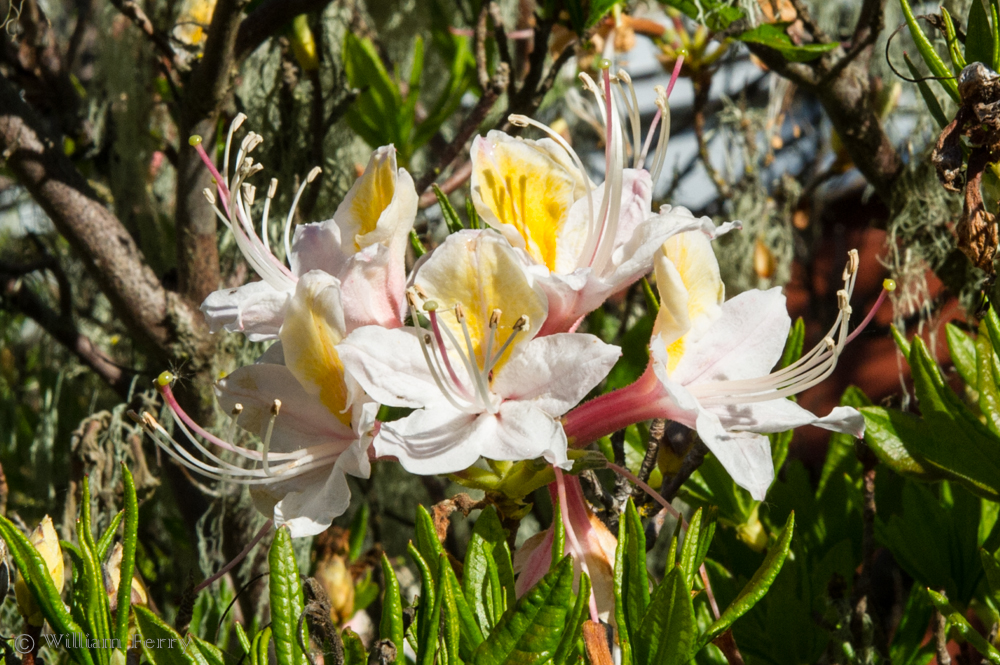 Spring was underway in Duncans Mills. I certainly recognize the wild azaleas at right but was stumped by the colorful blossom in the planter at right. Looked a little like a Christmas ornament.